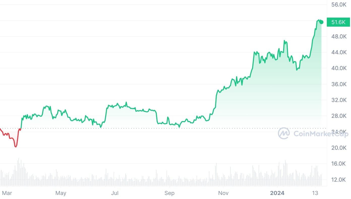 Following a widespread crypto surge that saw the second-biggest token, Ether, return to the level before the collapse of the TerraUSD stablecoin nearly two years ago, Bitcoin surged to around $52,000.