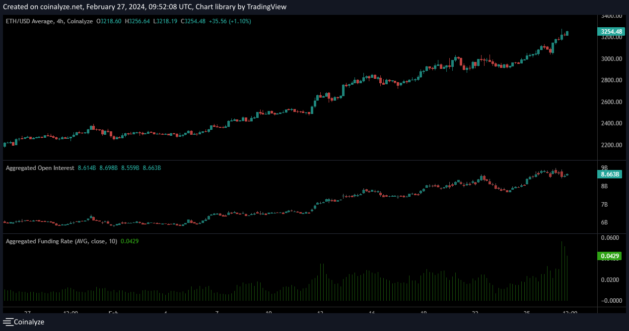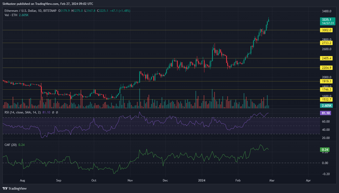Ethereum’s daily price chart showed the second largest cryptocurrency has been on a bullish run since the start of February. It rose by over 43%, as the price moved from $2.2k to its current price of $3.2k.