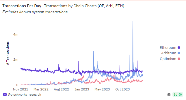 According to this analysis of transactions per day by Blockworks Research, transactions on Optimism and Arbitrum combined has surpassed Ethereum transactions alone since February. For example, on Feb. 20, Optimism recorded 425,266 and Arbitrum captured 871,993 transactions on the same day for a combined figure of 1,297,259. On the same day, Ethereum's total number of transactions was 1,149,756.