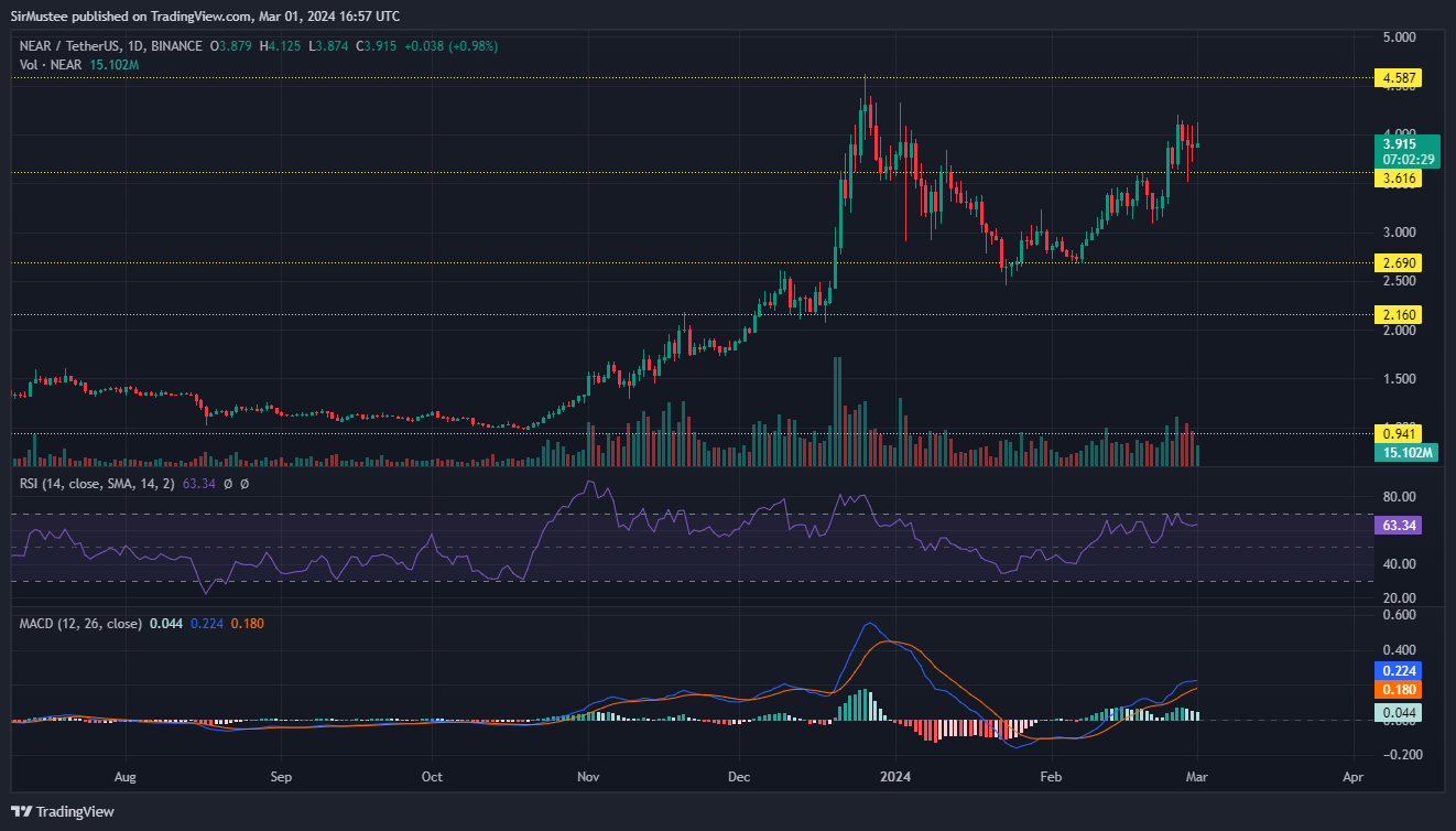 The growing bullish sentiment in the market is driving the demand for altcoins such as NEAR with Bitcoin (BTC) hitting $64.1k before a slight dip to trade at $61.5k, as of the time of writing.