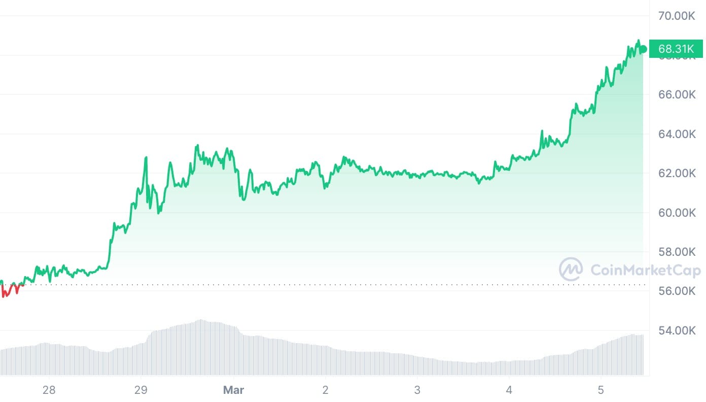 The token's 21% increase in value over the past week is the most significant in a year. It's market cap is now $1.34 trillion, or 53.31% of the global crypto market cap of $2.52 trillion, according to Coinmarketcap data.