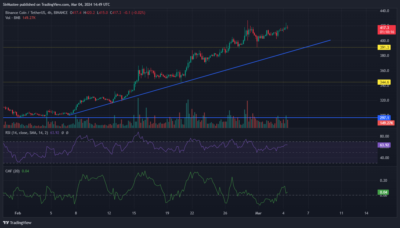 The bullish conquest of the price resistance around $390-$400 extended BNB’s bull run from the $300 support level. With a successful retest of the support level at $391 on 1 March, can BNB push on to reach $500 this month?