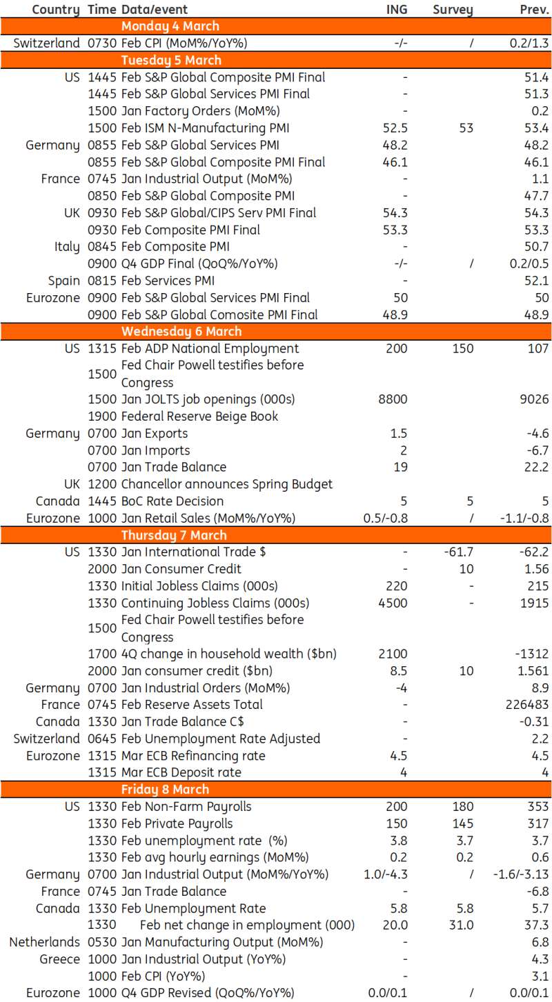 An important week in the US will see Fed Chair Jerome Powell testifying before Congress, as well as the release of February's jobs report following a blowout in January.