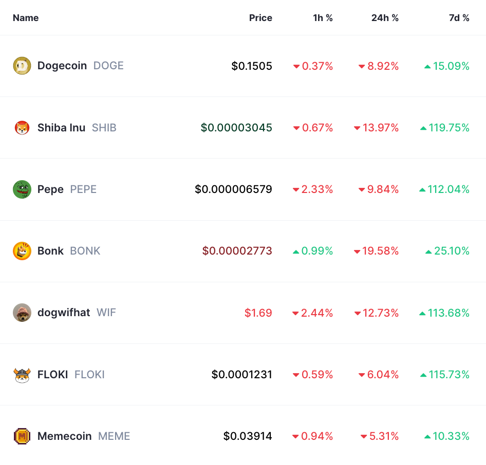By comparing the majority of the top Memecoins' performance over the last 24 hours with their 7-day performance, we're offered a clear demonstration of the asset group's wild volatility.