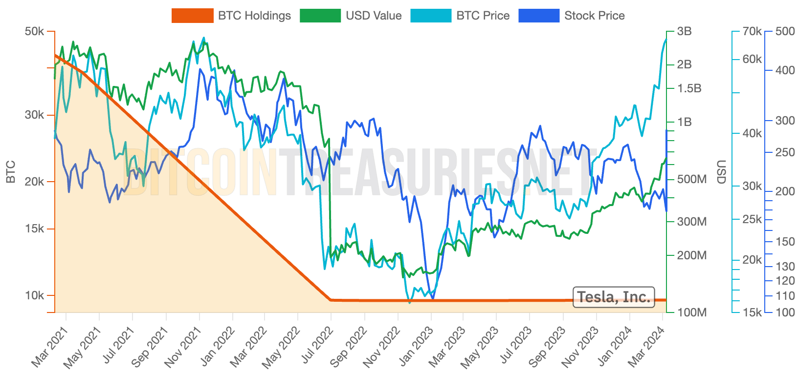 Tesla purchased $1.5B of BTC in Jan 2021, and sold BTC on 2 occasions: $272M BTC in Q1 2021, and $936M BTC in Q2 2022. Tesla allowed purchases of Teslas in Bitcoin between March 24 and May 12 2021.