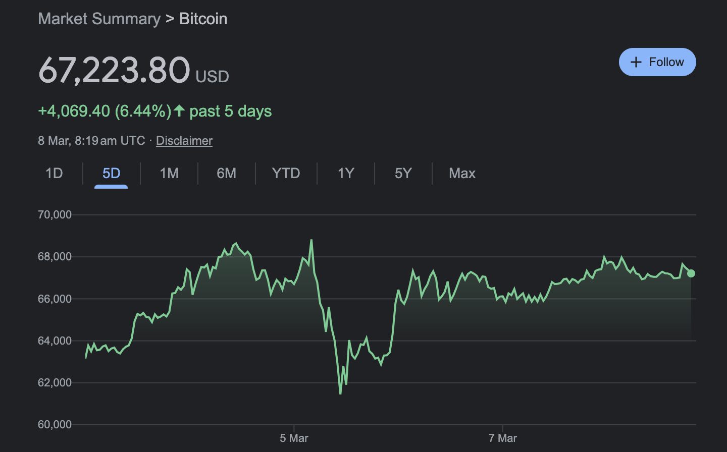 Fortunately, Bitcoin has recovered much of its midweek "losses" and returned to the $67K mark. Not quite its top-end but still a comfortable enough zone to reinforce "bull" status for the market. It's finally safe to check your trading account's balance.