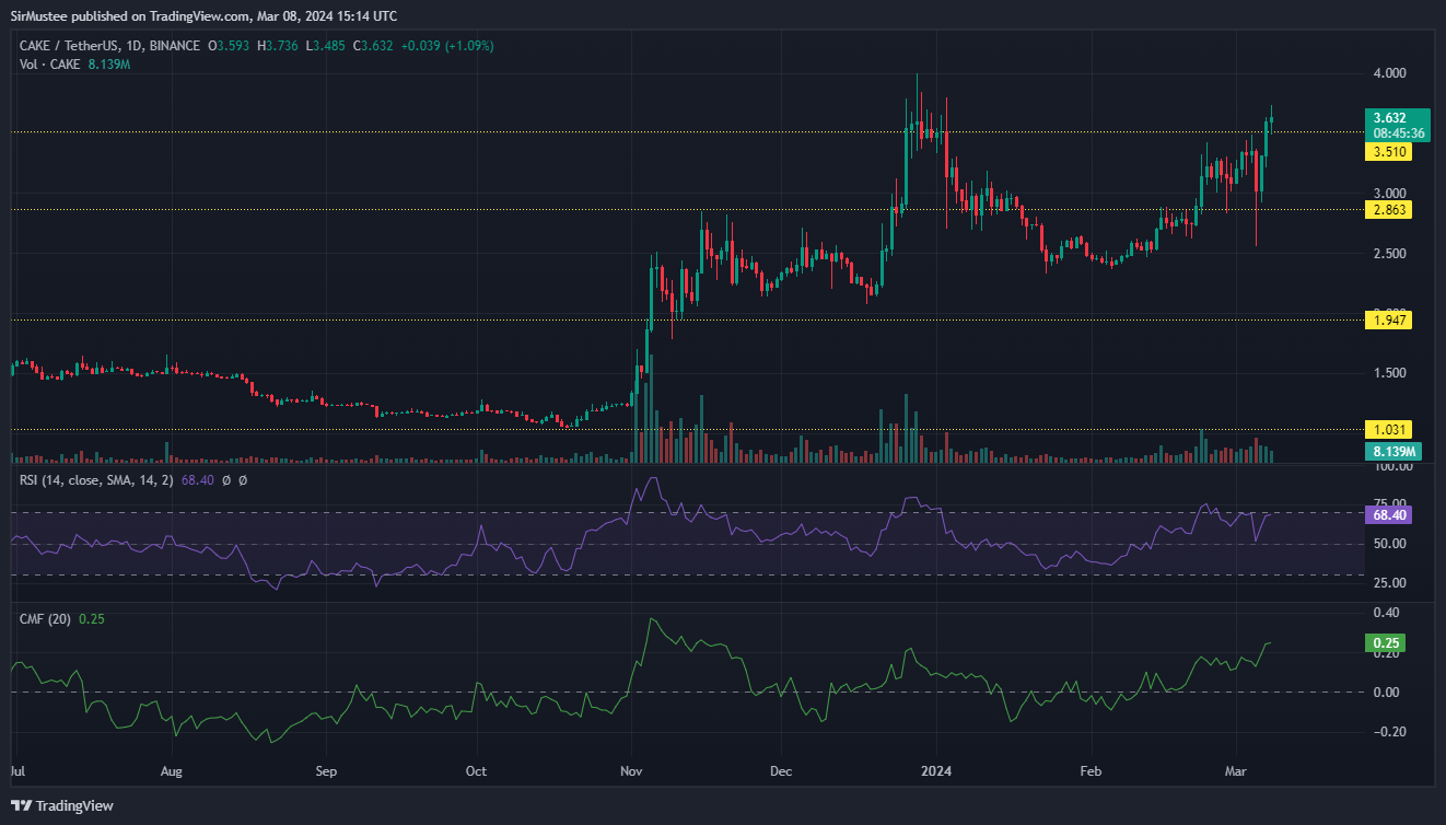 The strong buying pressure on CAKE was evidenced by its consecutive bullish candles on the daily timeframe. This saw the altcoin flip the critical $3.5 resistance to support. Earlier in January, CAKE’s bullish run had faltered at the $3.5 resistance, leading to a 35% retracement.