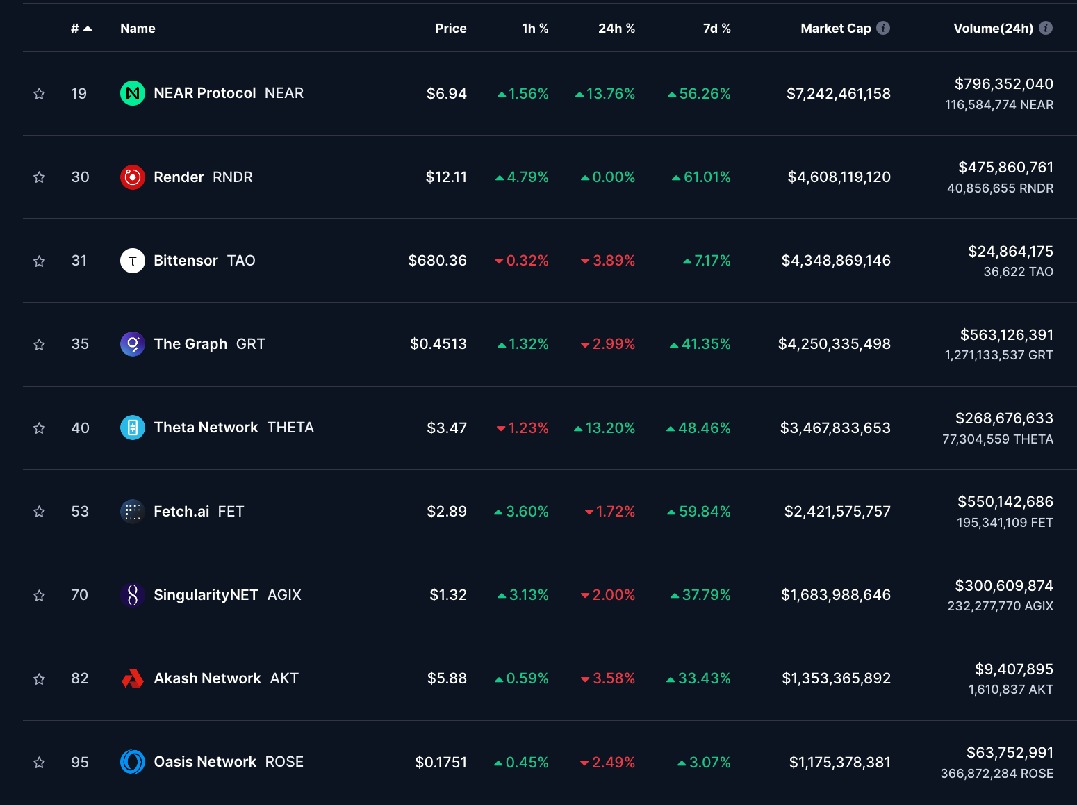 An initial glance at the top AI coins on CoinMarketCap would suggest that the AI crypto market is flourishing. NEAR is up more than 55% over the week, Fetch.ai (FET) is seeing almost 60% returns, and Render's (RNDR) weekly gains are over 61%.