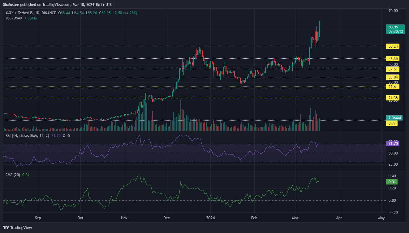 The price action on the daily timeframe showed that AVAX could be headed to $70 next after breaking the $60 psychological barrier.