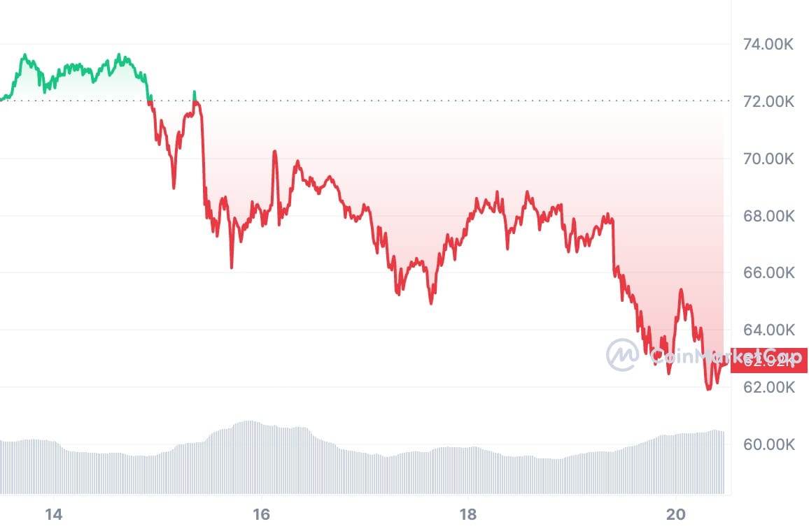 Bitcoin, which surged to over $73,000 last week, has taken a nosedive, plummeting over 6% to currently trade around $61,500 earlier this morning, following a 7% tumble the day before, as investors grapple with the potential impact of the Fed's upcoming interest rate decision.