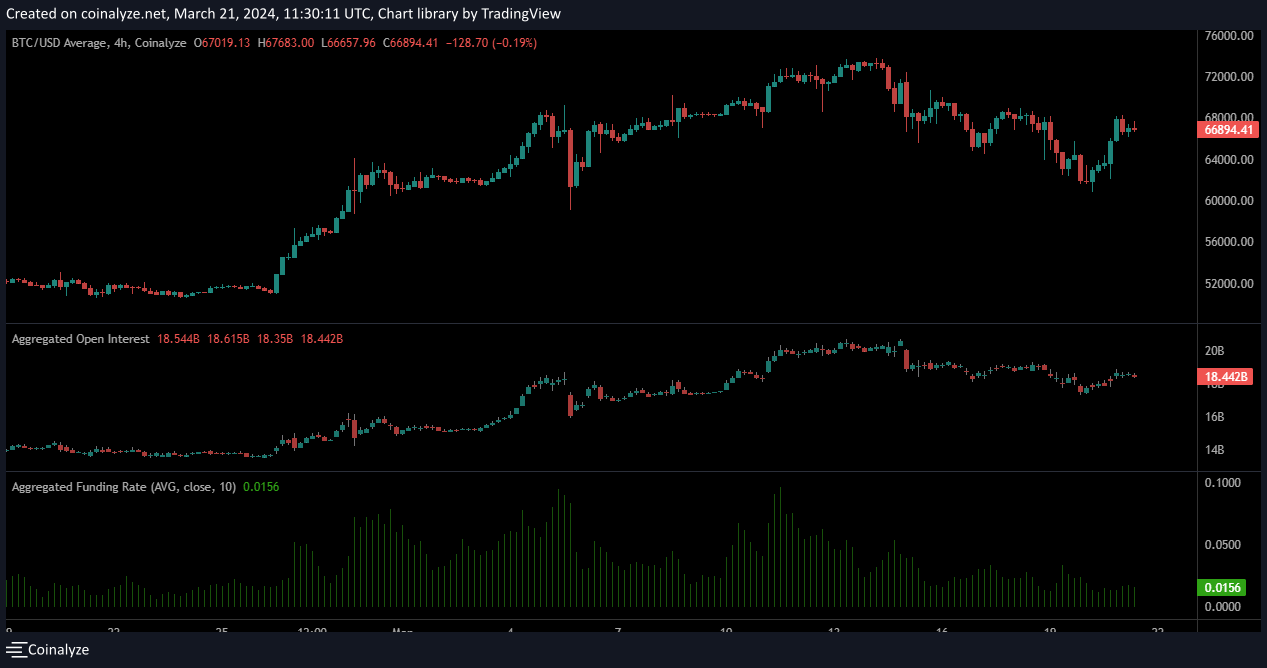 Despite the outflows on Bitcoin ETFs, traders in the futures market continued to bet big on BTC going on another bullish run. Open Interest (OI) data from Coinalyze showed a 2.33% rise over the past 24 hours. This took the total Open Interest on Bitcoin to $18.4 billion.