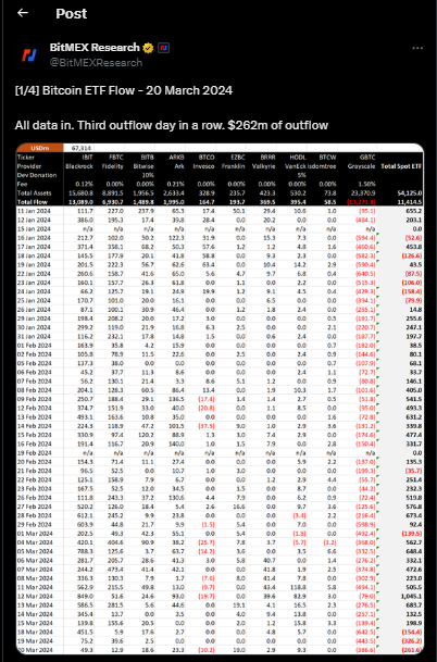 Data from BitMEX Research showed that Bitcoin ETFs experienced a third day of outflows in a row with $262 million recorded in net outflows. With the much anticipated Bitcoin halving still 30 days away, the outflows hinted at price consolidation moves by investors.