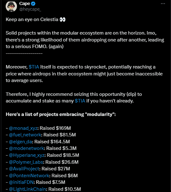 A recent tweet by @heycape_ highlighted a list of solid projects on the Celestia ecosystem that have raised a combined funding of $660 Million.