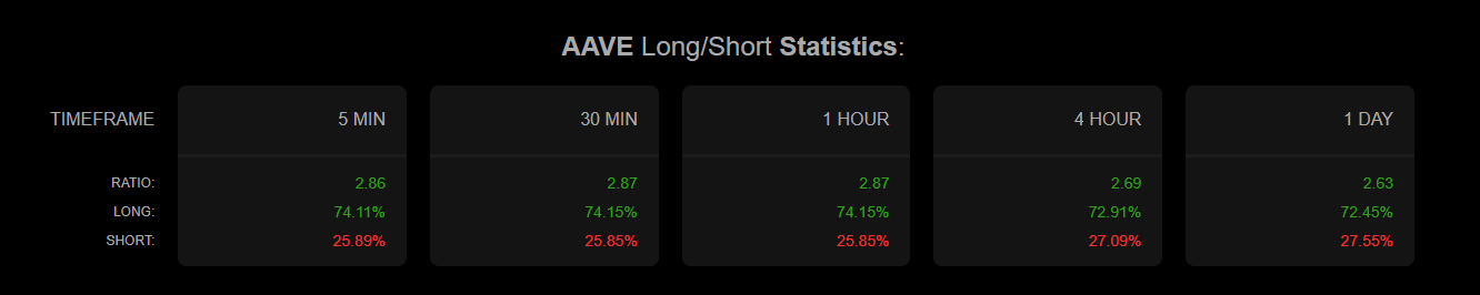 A look at the futures contracts for AAVE also showed that market participants were fully bullish. Data from Coinalyze revealed that both the short term and long term outlook for AAVE was in strong favour of buyers with over 70% of the futures positions currently long.