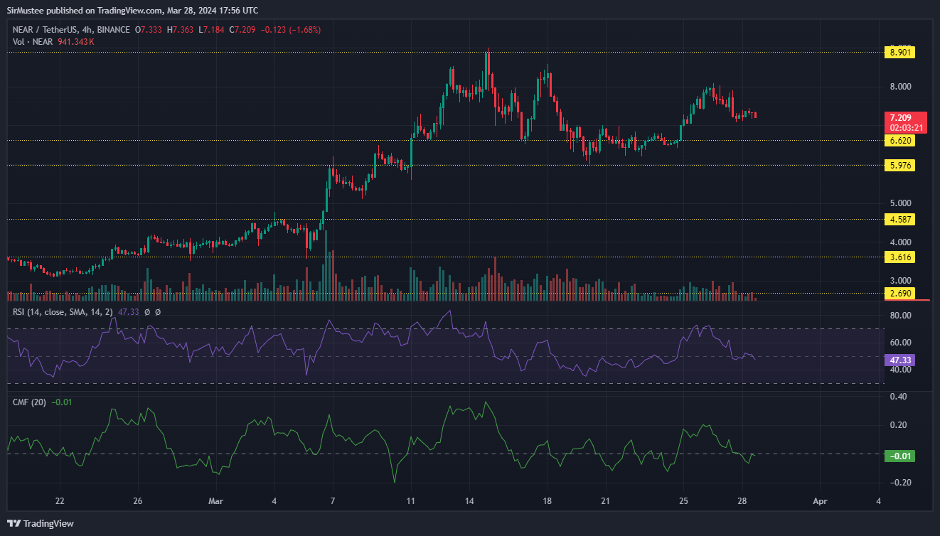 Similarly, the departure of capital from NEAR was seen on the Chaikin Money Flow (CMF) but it also stayed around the zero mark to hint at neutrality in the capital inflows/outflows.