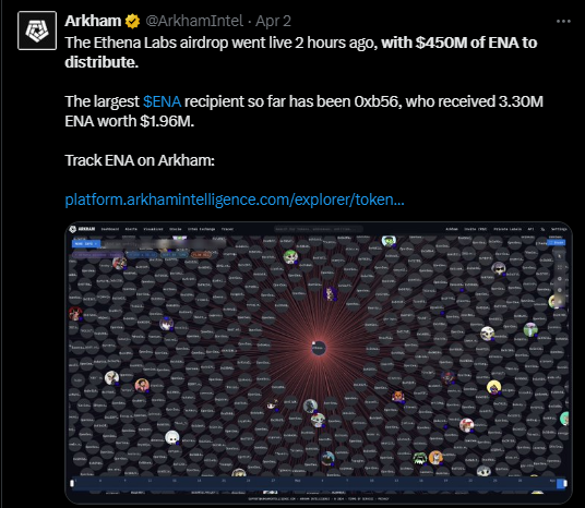 On-chain data analyzed by Arkham Intelligence showed that a total of $450 million worth of ENA tokens were airdropped to participants with the largest recipient receiving nearly $2 million of Ethena (ENA) tokens on April 2.