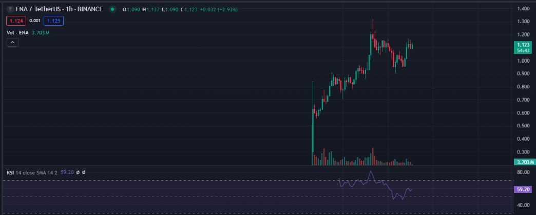 ENA is currently trading at $1.12, a 13% dip from its ATH over the past 24 hours. However, early buyers still remain in profits with the token opening for trading at around $0.30.