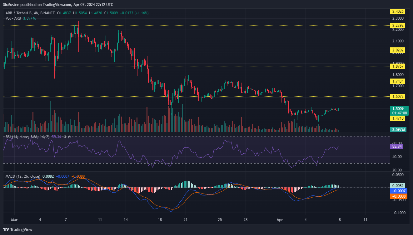 The Relative Strength Index (RSI) making a jump from oversold territory to bullish zone over the past two days signalled at a heavy influx of buying pressure for ARB. As of the time of writing, the RSI had a reading of 55, representing a trend shift from bearish to bullish on the four-hour timeframe.