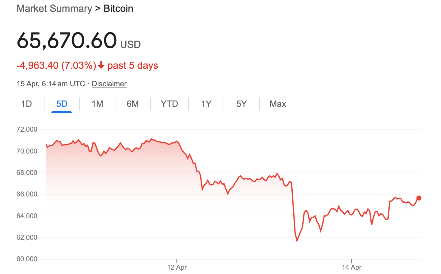 Bitcoin suffered its biggest pullback since March 2023 after Iran launched air attacks on Israel. The leading cryptocurrency fell to as low as $62K over the weekend but has since recovered to the high $65K zone.
