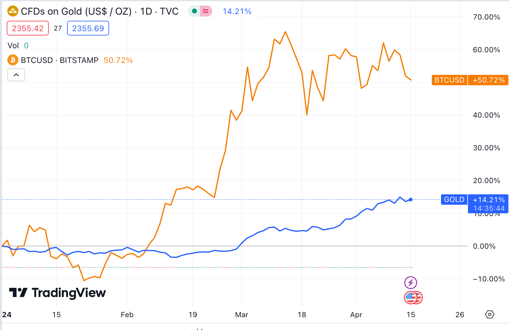 Gold poses a big challenge to digital assets. In recent weeks, the yellow metal has claimed a large portion of the haven bets, limiting Bitcoin's appeal. Gold was already on a bull run, hitting a new high of $2,431.29 but news of Iran's air strike and uncertainty surrounding Israel's response have inspired more confidence in the commodity.