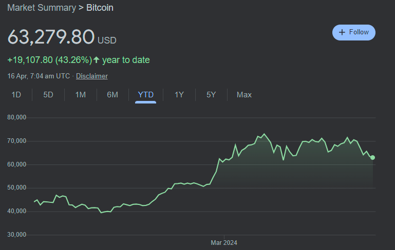 Year to date, Bitcoin's price has risen more than 40%, though it's taken a bit of a wobble over the past few days with Chinese interest pushing it up but the Iran-Israel war pushing it down.