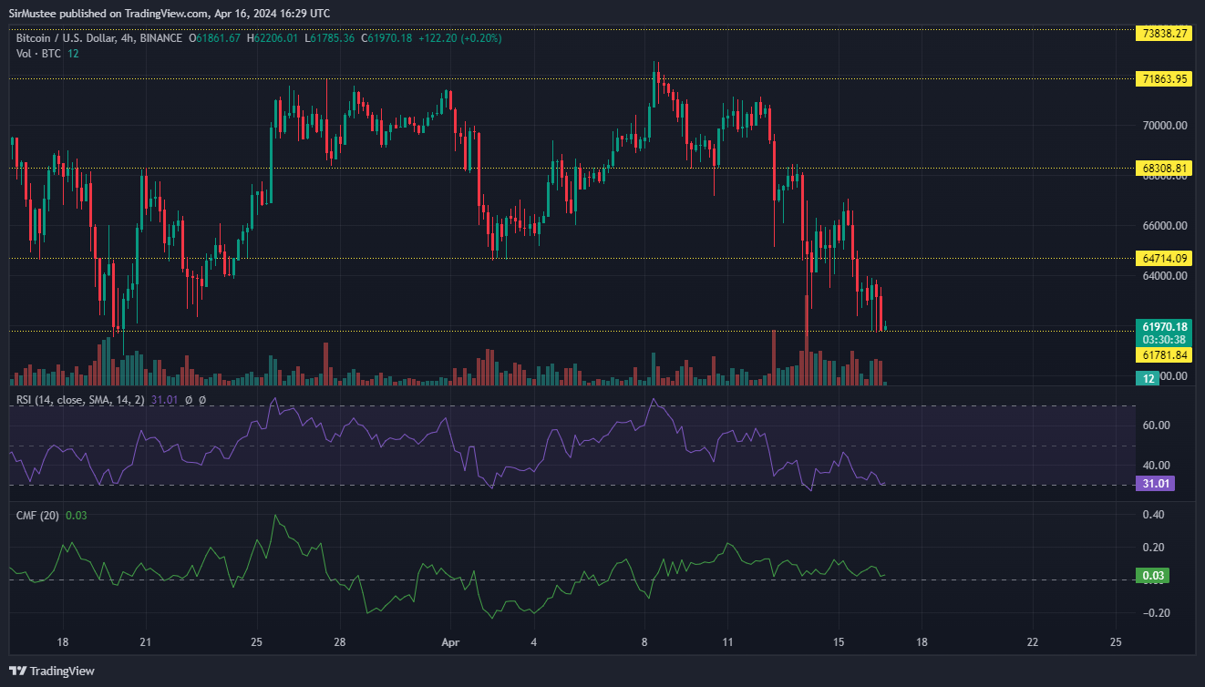 Analyzing BTC’s price action on the four hour time highlighted the $61.7k support level as a key buying level for BTC bulls. This was evidenced by the strong pump from the level earlier in March with BTC producing a swift 10% rise from the critical support level within 24 hours.