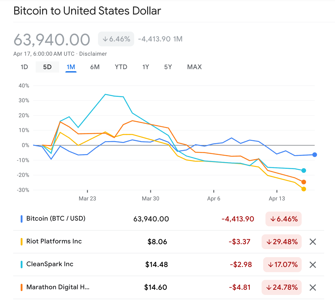 Their ongoing efforts to optimize Bitcoin production and mining operations further demonstrate their preparedness for the halving, though its stock is down almost 25% over the past month, following an almost fourfold rise between November 2023 and the start of 2024.