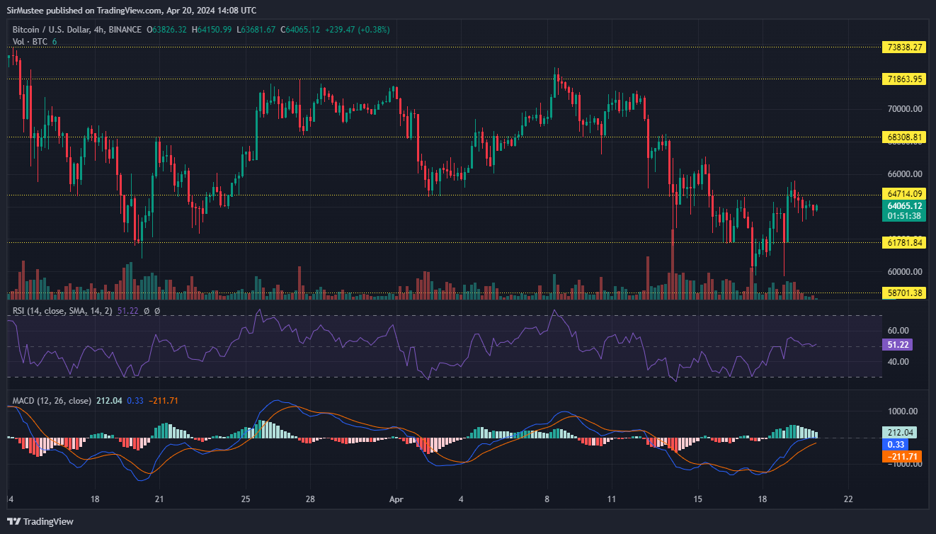 The price of Bitcoin at the time of halving (April 20 UTC+8) was $63k. Since then, Bitcoin has moved by $1,000 and it was trading at $64k, as of the time of writing.