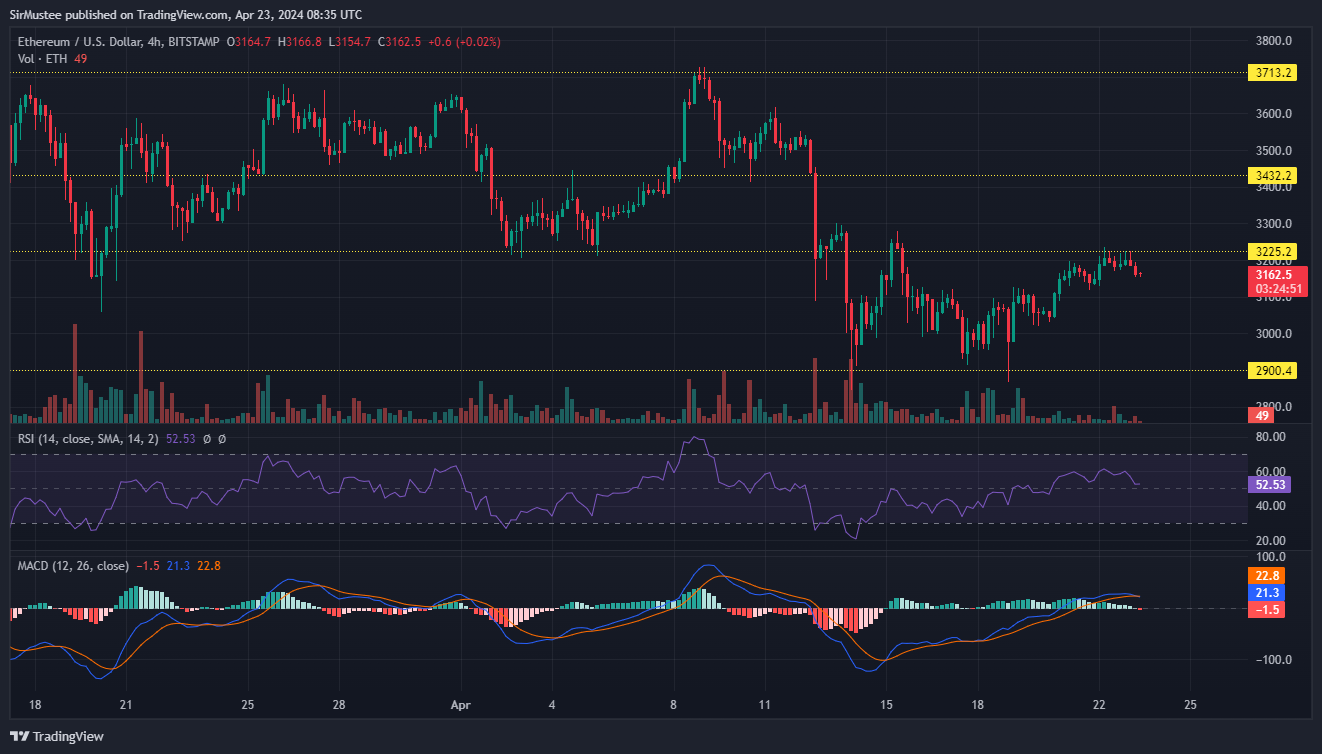 Analyzing ETH’s price action on the four-hour timeframe showed that buyers have struggled to scale the selling hurdle at $3.2k. The first attempt at scaling the hurdle on April 15 was met with a swift rejection with price dropping by 9%.