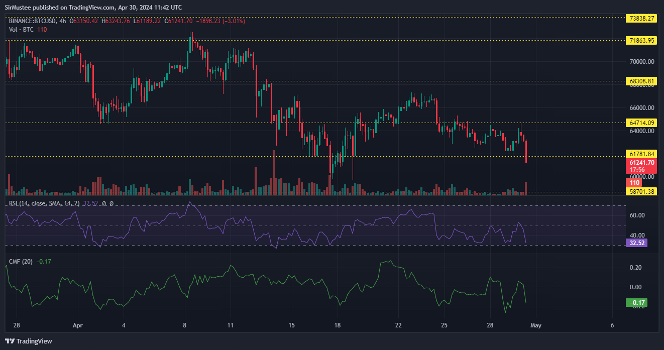 Three bearish candlesticks in a row on the four-hour timeframe saw Bitcoin (BTC) drop sharply from $64.7k to $61.7k. As a result, the Relative Strength Index (RSI) flipped from buying to selling territory with sellers overwhelming buyers on the lower timeframes.