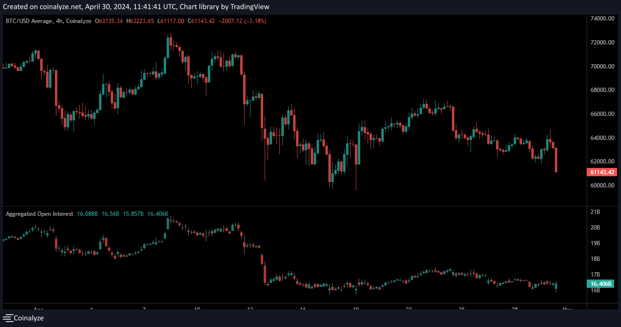 With the aggregated Open Interest standing at $16.406 Billion, buyers can potentially hold the $61.7k level in the short term.