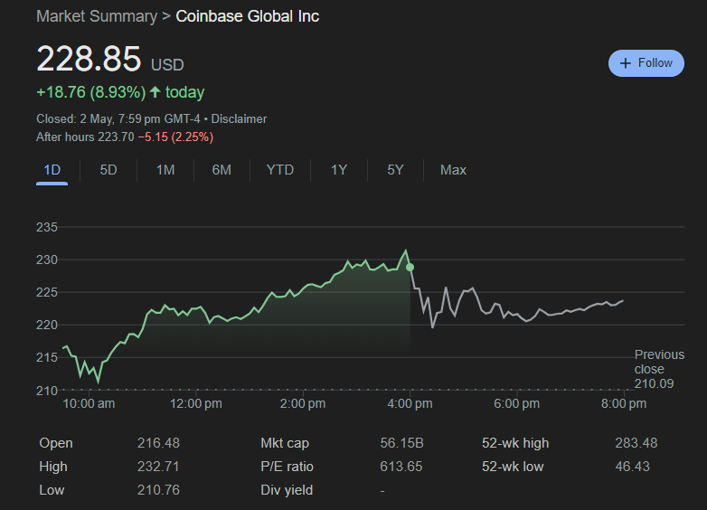 Coinbase's stock price rose 9% ahead of its earning report but has slipped 2% in after-hours trading.