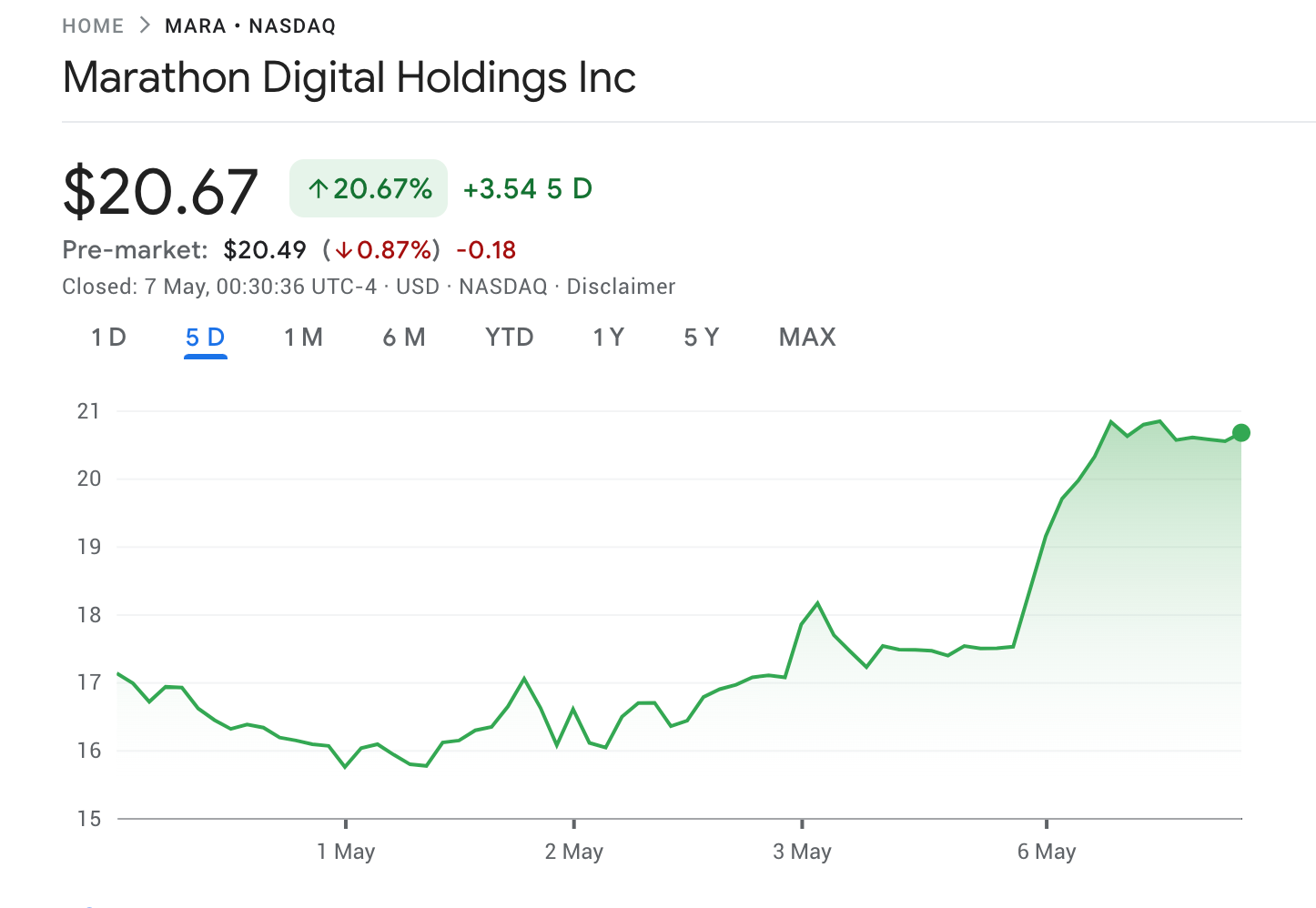 Marathon Digital Holdings has seen a rollercoaster year in the stock market. The company's stock price (MARA) has soared over 17% up to opening price on May 6, reaching $20.67, following the news. This comes after a strong week, with a 33% return for shareholders. However, looking at a larger timeframe, the stock is still down compared to its 52-week high of $34.09.