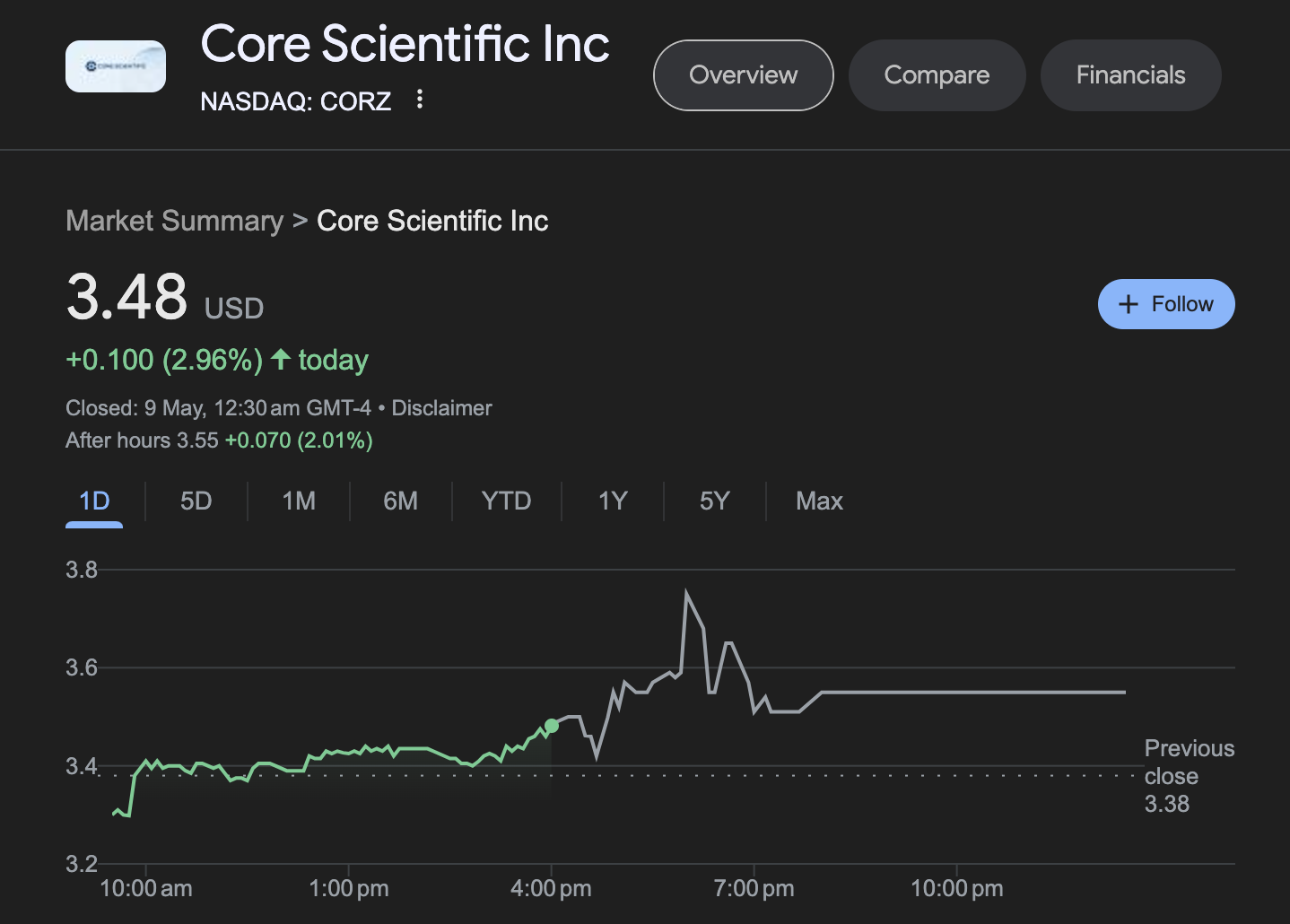 Core Scientific's stock price increased as much as 7.75% in after-hours trading.