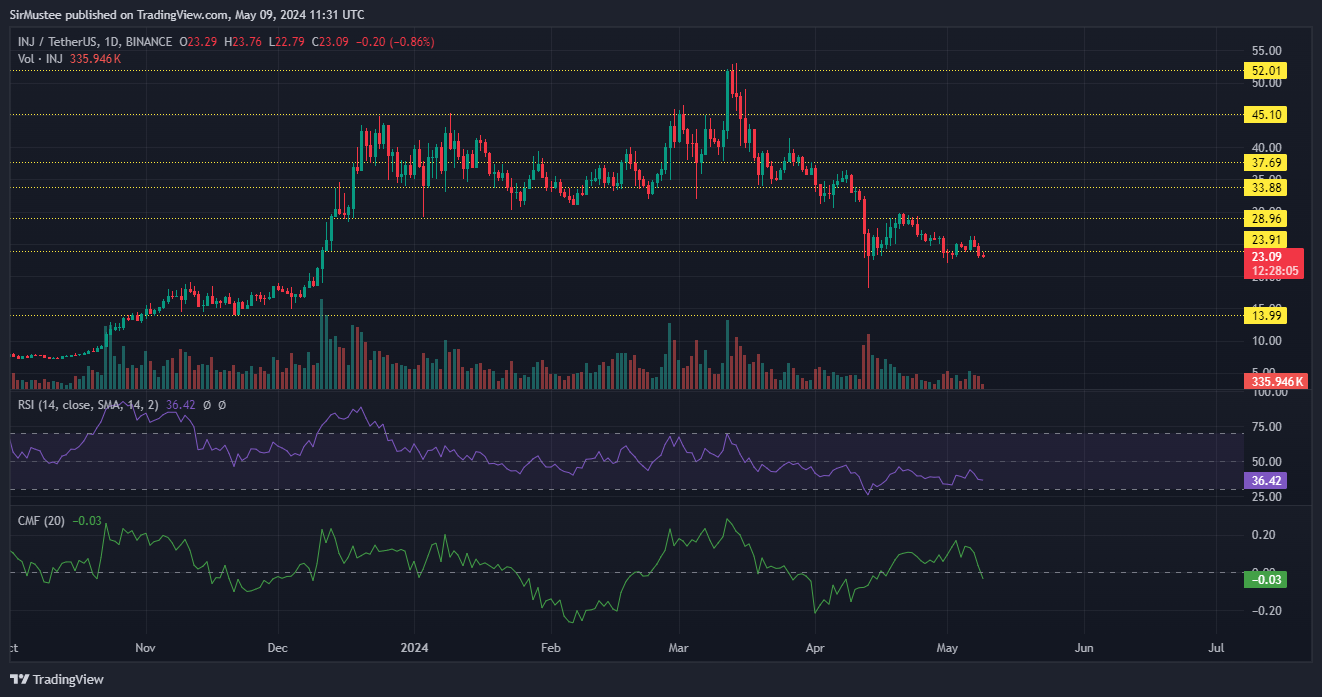This was illustrated by the Relative Strength Index’s (RSI) sub-neutral 50 movement, due to the significant selling pressure. This has kept INJ on a bearish trend both on the daily timeframe and lower timeframes.