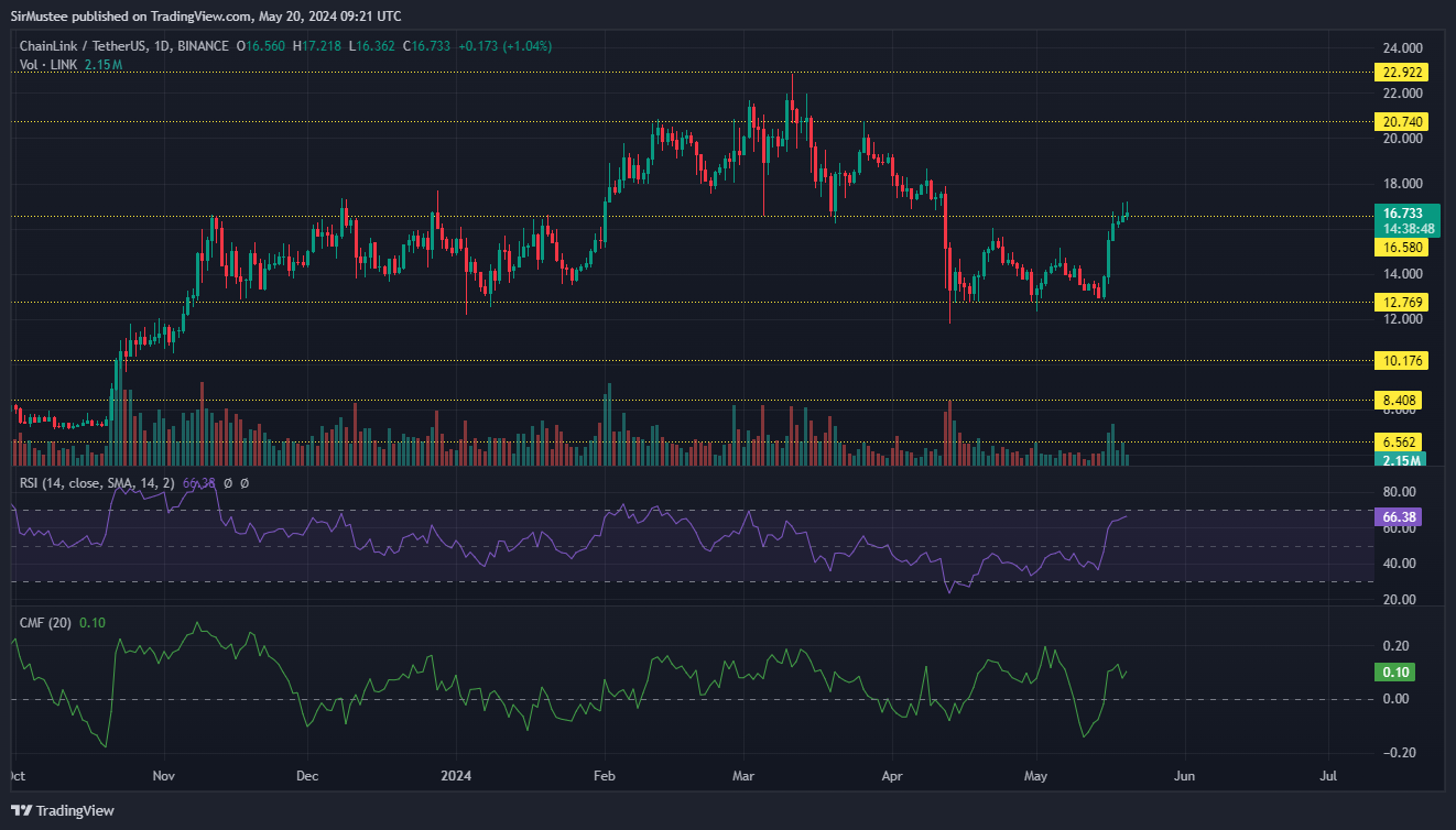 This notable rise led LINK to reclaim the vital support level at $16.5 price level, offering a new opportunity for buyers to join the bullish pump.