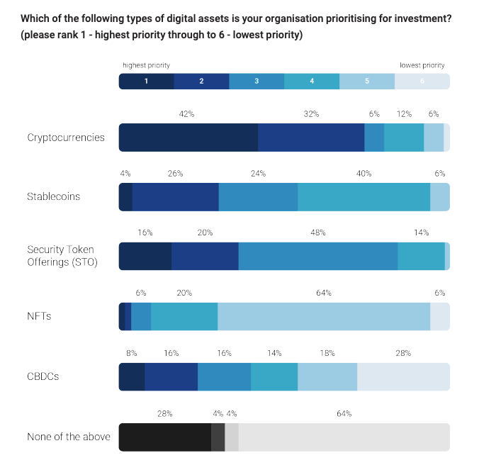 Looking ahead, 33% believe CBDCs will see the biggest adoption over the next three years. 23.5% think cryptocurrencies will take the crown while 21.6% predict tokenized securities will draw the most attention. 62% of institutions reported that their clients have expressed interest in tokenized securities.