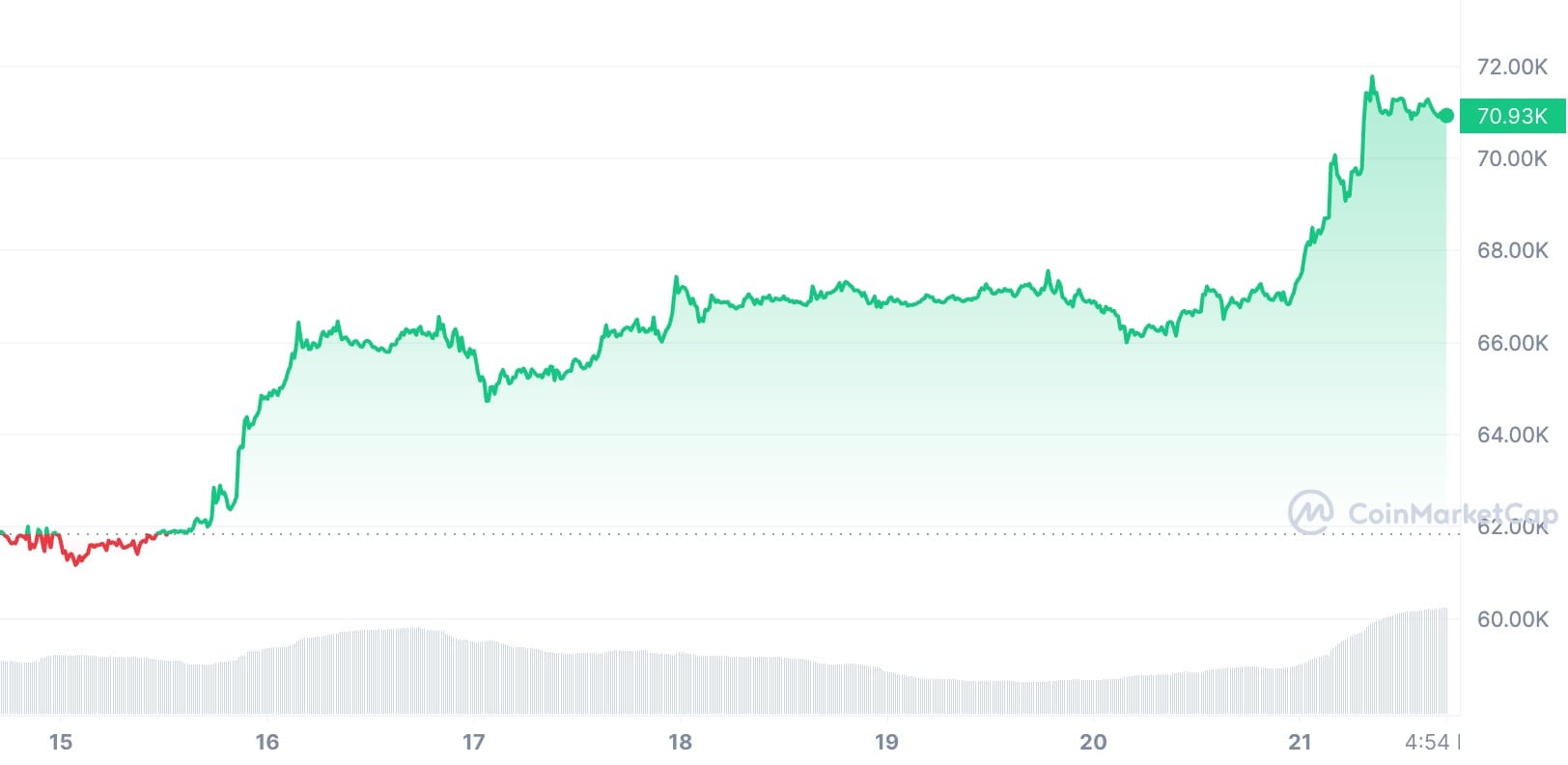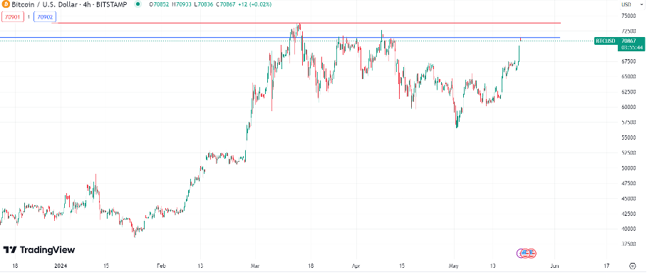 Bitcoin is now closing in on the $71,500 resistance level and breaking it could lead to a new all-time high. However, failing to break it despite the recent good news could exert downward pressure and push it back to a $68,500.
