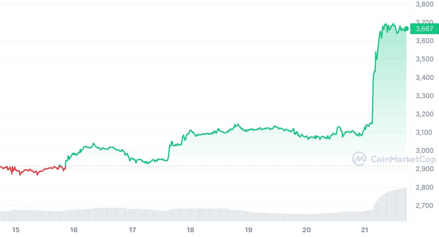 Amid mounting speculation that authorities are beginning to soften their stance towards licencing ETFs that invest directly in the second-biggest cryptocurrency, Ether, the price of the digital asset rose to its highest level in 18 months, up some 25% in the past 24 hours to sit at $3,666.71 at time of writing.