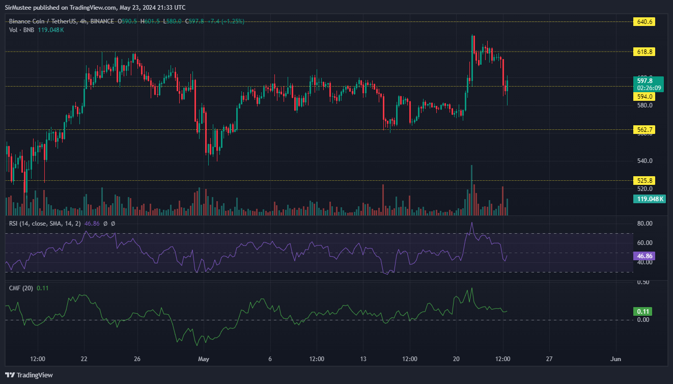 Earlier BNB buyers had tried to break above the $618 resistance and push for a new all-time high (ATH) but the selling pressure was still present at the level that mitigated the bullish run-up.