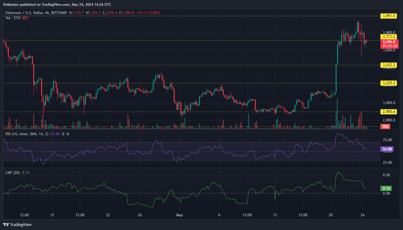 On 20 May, ETH pumped 15% rising from $3.1k to $3.7k with the Relative Strength Index (RSI) noting the buying strength by rising to 93. Similarly, the Chaikin Money Flow (CMF) surged to a monthly high of +0.53.