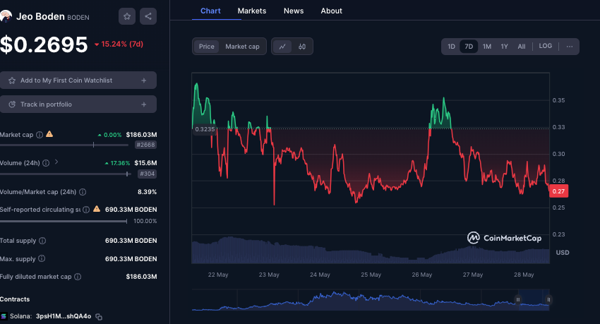 As Trump increases his popularity among the crypto crowd, Joe Biden is losing friends in the space. While memecoins TREMP and MAGA shot up after Trump's pro-crypto words, Jeo Boden (BODEN) has cratered almost 18%.