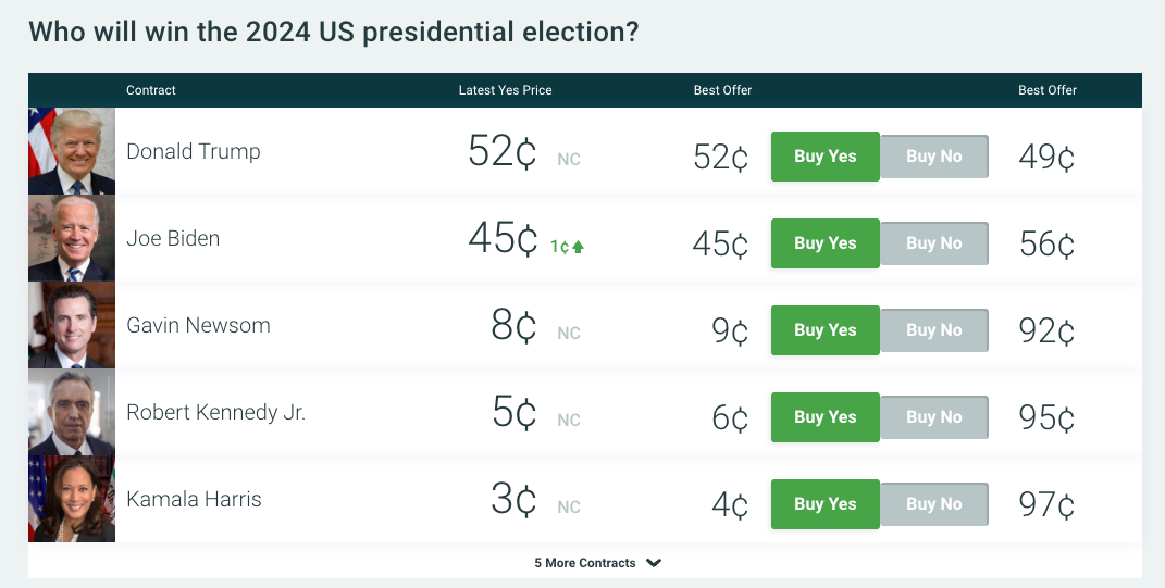 A bet titled 'Who will win the 2024 US presidential election?' on PredictIt shows Trump in the lead with a "yes" vote costing 52c. A "yes" vote for Biden costs 45c.