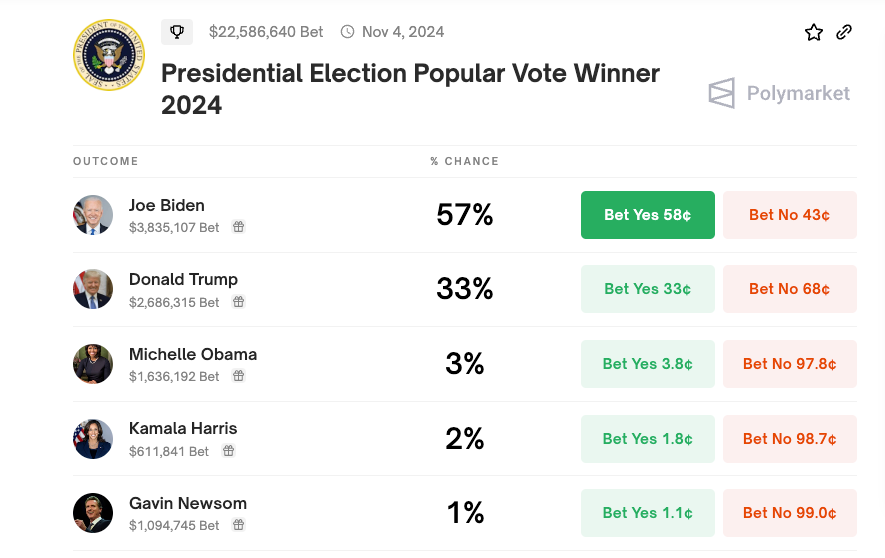 That said, Polymarket shows Biden's odds of winning are at 57% while Trump has a meager 33%.