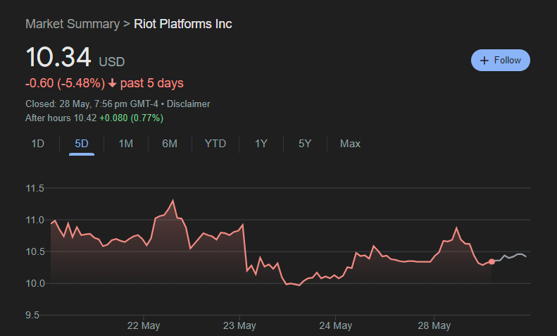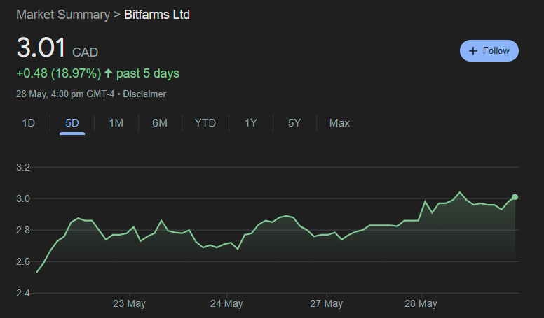 Riot's stock price is down 5% over the past five days whilst Bitfarms has seen its share price jump almost 19%.