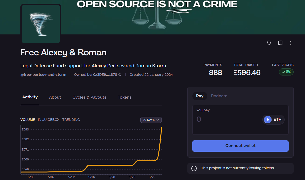 The "Free Alexey & Roman" crowd-sourced fund now has over 596 ETH from 988 payments.
