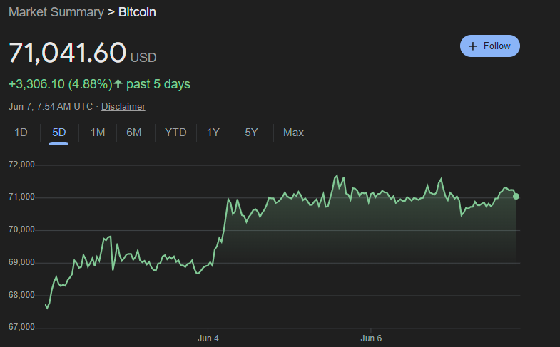Anyway, at least the markets displayed good behaviour this week. Bitcoin finally topped $70K again and Ethereum... Well, it's green at least.