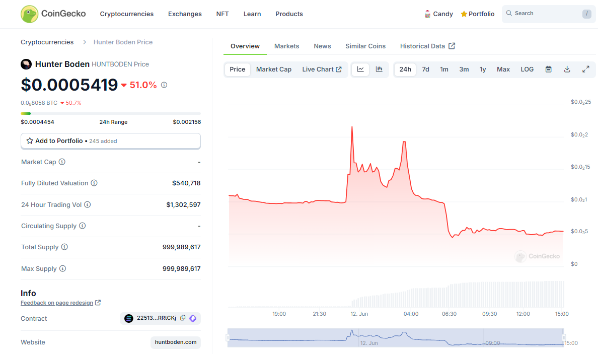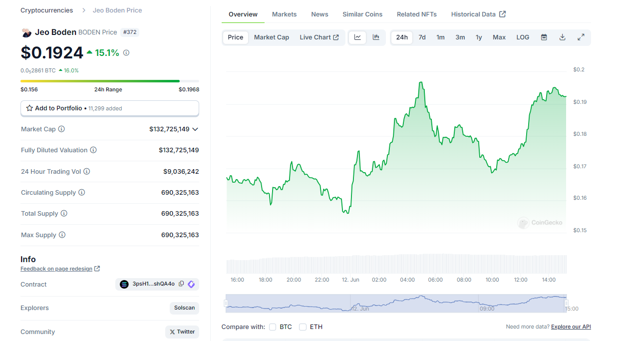 Meanwhile, Hunter Biden's guilty verdict has triggered Biden-related memecoins to soar. The President's son was found guilty on three counts related to gun charges. In the hours that followed, Jeo Boden (BODEN) Solana memecoin jumped 15% while Hunter Boden (HUNTBODEN) skyrocketed 116% in under 30 minutes after the verdict.