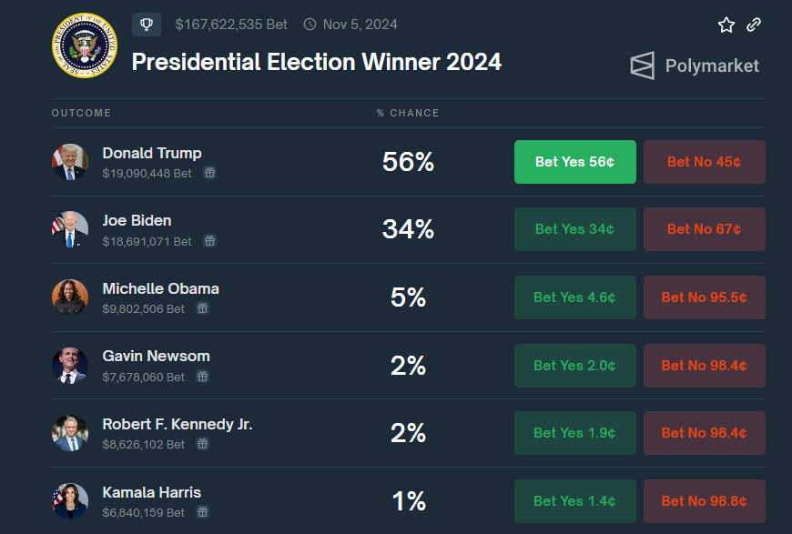 Votes on crypto betting site Polymarket show that Trump is the clear Presidential favourite with 56% odds of winning compared to Biden's 34%.