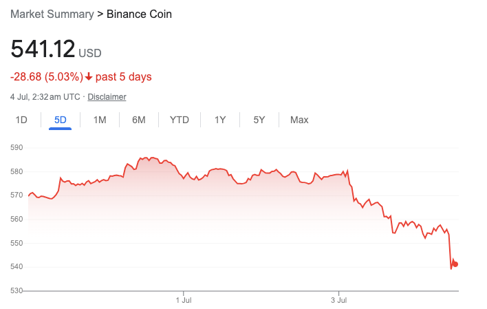 Despite Binance's win against the SEC, the price of BNB remains in the red this week - down 5% over the last five days.